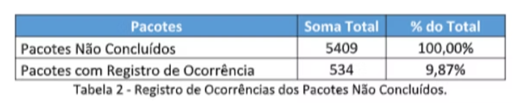 Como dito anteriormente, é importante que se faça o registro das ocorrências que impedem a conclusão dos serviços para que estes problemas sejam resolvidos de forma que não voltem a ocorrer nas semanas seguintes. No monitoramento realizado foi verificado uma dificuldade das obras em se fazer este levantamento. A Tabela 2 a seguir mostra que somente 9,87% dos pacotes não concluídos tiveram um registro de suas causas.