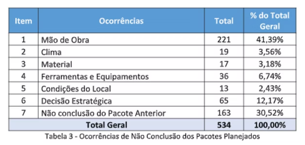 A Tabela 3 a seguir apresenta as ocorrências de não conclusão dos pacotes planejados divididos pelas categorias: Mão de Obra, Clima, Material, Ferramentas e Equipamentos, Condições do Local, Decisão Estratégica e Não Conclusão do Pacote Anterior.