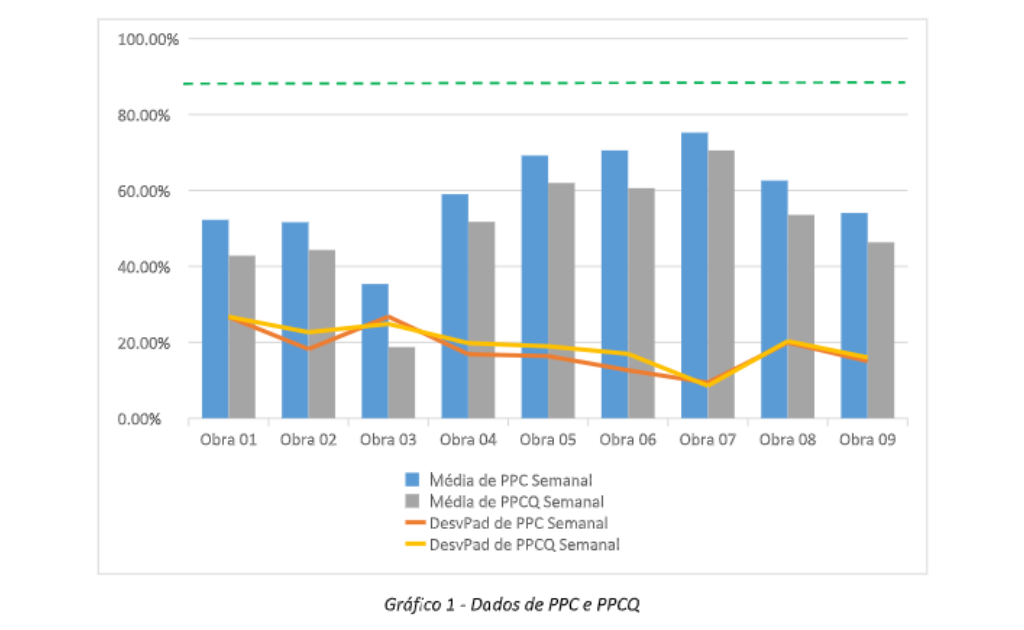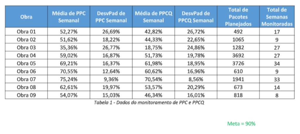 Trazendo a teoria para a prática, iremos a seguir apresentar dados de um monitoramento de PPC e PPCQ de 9 obras de uma mesma construtora.