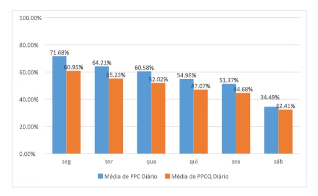 Analisando os indicadores diários (PPC diário e PPCQ diário) no Gráfico 2 a seguir, podemos observar que as obras possuem maior aderência ao planejado nos primeiros dias da semana, resultando em indicadores maiores, e que as obras possuem maiores dificuldades de cumprir as metas na segunda metade da semana, onde possuem indicadores mais baixos.